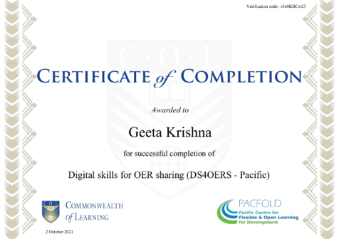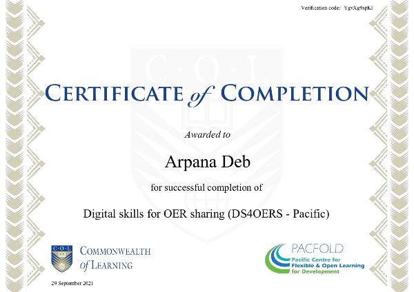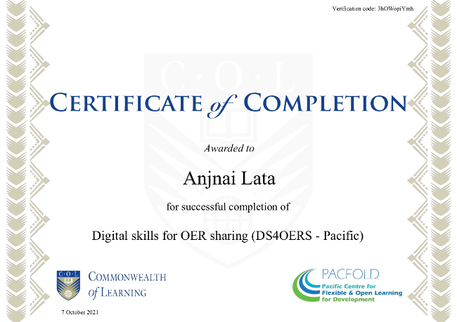 We extend our congratulations to Anjnai Lata on achieving the #DS4OERS #Certificate of Completion. Well done!