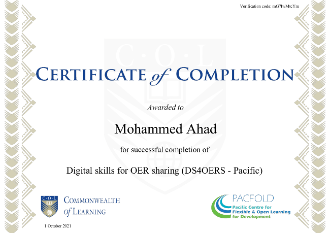@muqtadirahad Congratulations to Mohammed Ahad from π«π― who is the 2nd graduate of the #DS4OERS course. Celebrate your achievement. #certificate