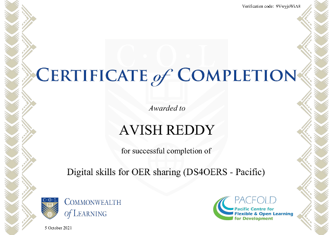 @avishreddy We welcome Avish Reddy on joining the cohort of #DS4OERS graduated having earned the #Certificate of Completion.