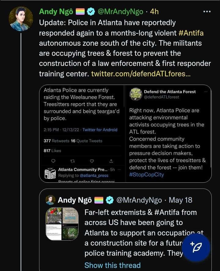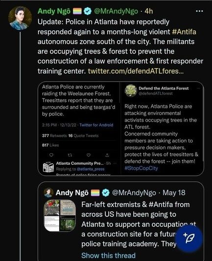 Today, treesitters and forest defenders in the #defendtheatlantaforest movement were attacked with chemical weapons. Several were arrested. We would like to put out a warning that fascist propagandist Andy Ngo has doxxed forest defender arrestees in the past, and so he has a high probability of doing this again. Supporting the Atlanta Solidarity Fund (https://atlsolidarity.org/#support) is probably the quickest and most direct way to support arrestees and the #dtaf and #stopcopcity movement.