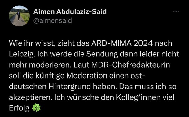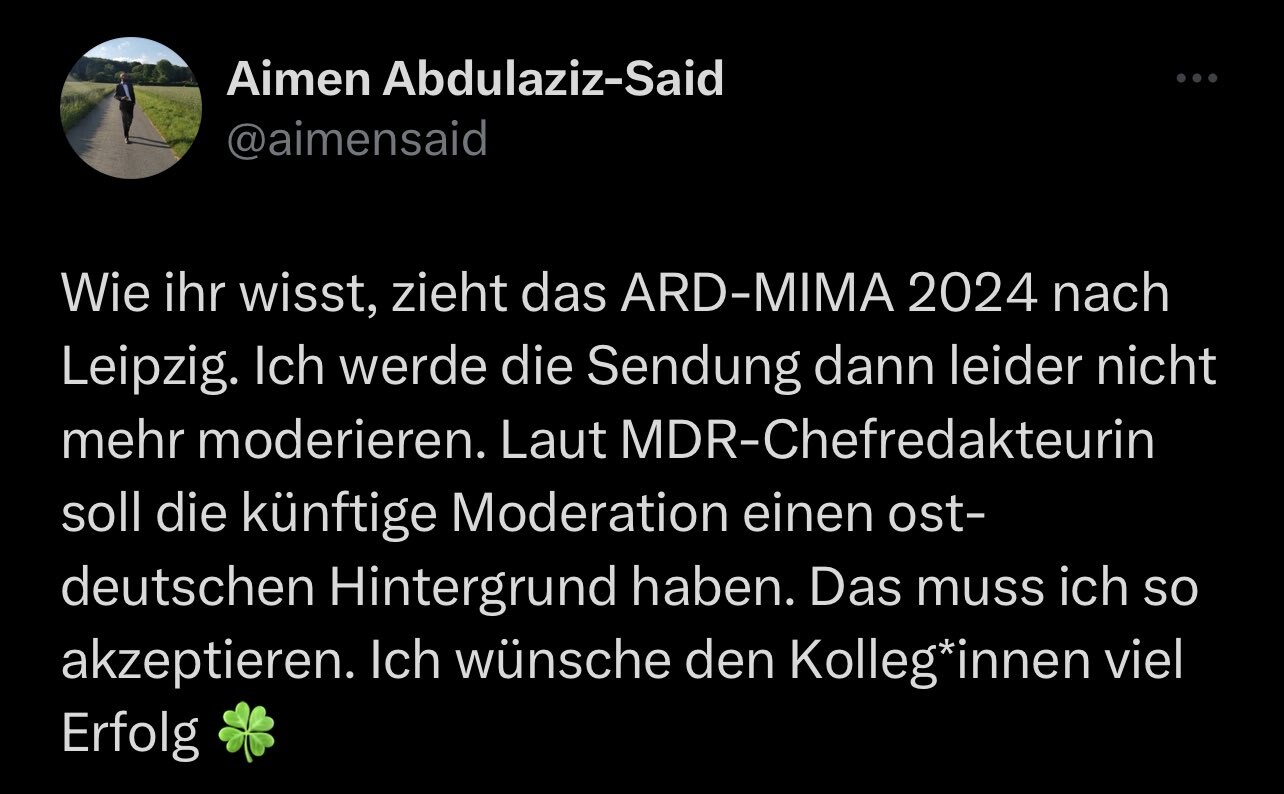 Zwei der wenigen farbigen Journalisten Deutschlands werden aus dem ARD-Mittagsmagazin entfernt, weil diese nach Leipzig wechselt und der MDR dort „Moderatoren mit ostdeutschem Hintergrund“ will (mit ziemlicher Sicherheit weiße Moderatoren).