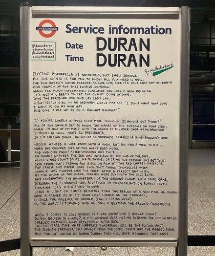 The legendary @duranduran are performing at @TheO2 for two amazing nights. The poem by @allontheboard is at North Greenwich.