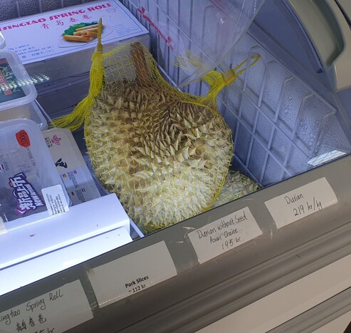 A new Asian food market has opened in town. Their durian is a lot less huggable than any other durian I've seen - and that's saying something.
