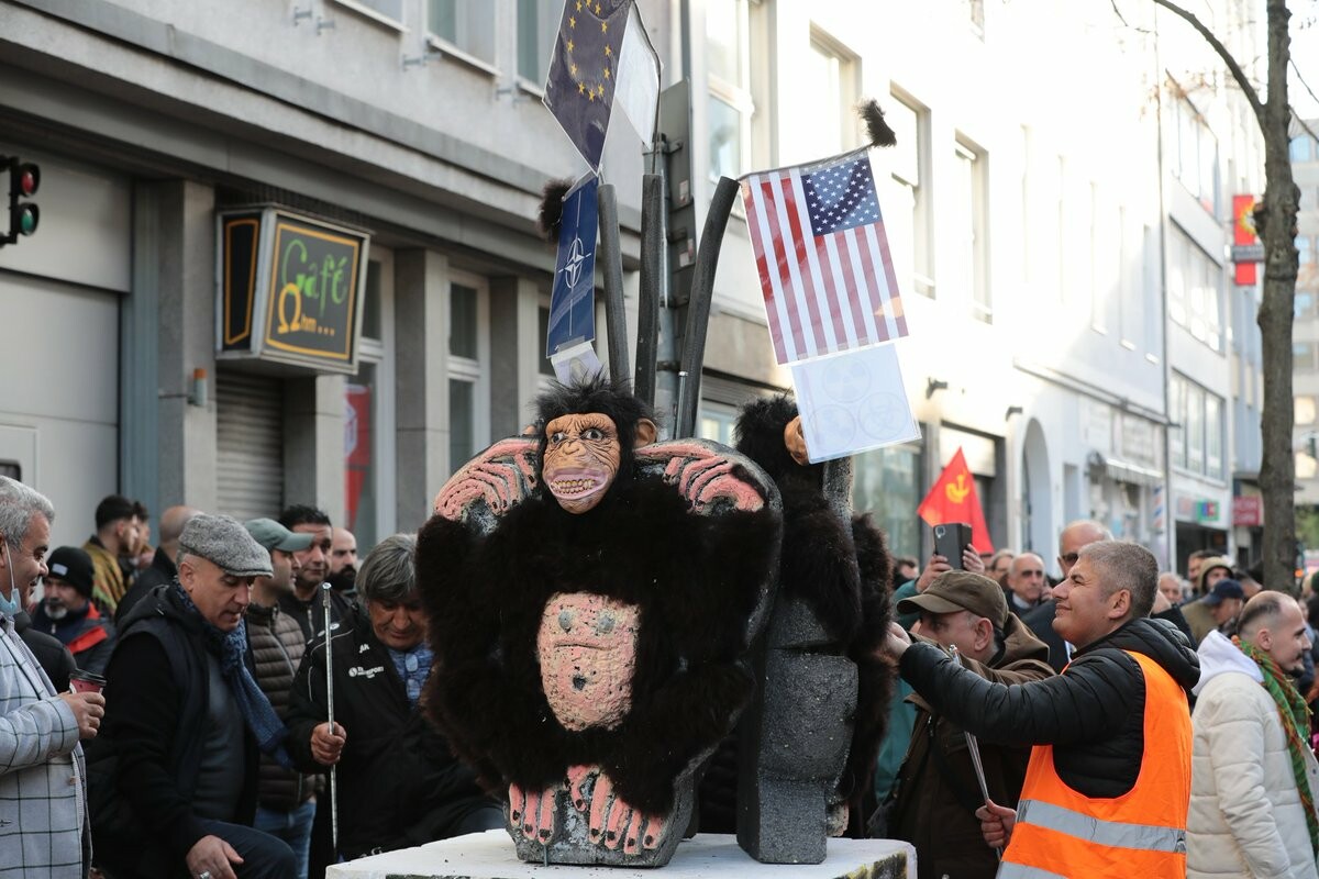 In #Düsseldorf vor dem Hauptbahnhof Sammelphase zur geplanten Demonstration "Stoppt die türkischen Giftgasangriffe in #Kurdistan". Installation mit drei Affen (nichts sehen, nichts hören, nichts sagen) mit den Fahnen der EU, Nato und USA. Um 11.00 Uhr soll es los gehen! #dus1211