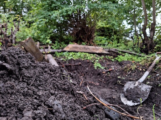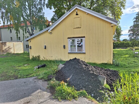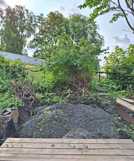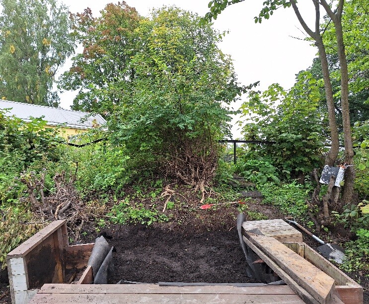 Nå gjenstår å legge på plass 2.5 tonn ny jord i hølet - og plante buskene.