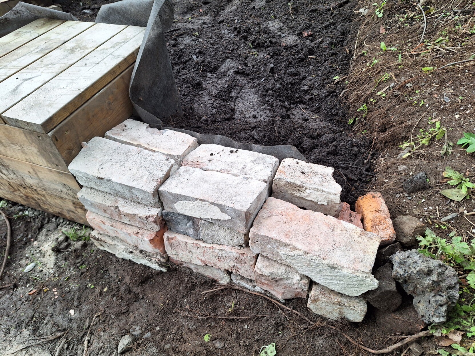 De siste "hullene" i konstruksjonen er tetta. Mellomrom mellom kasser og "bakvegg" tetta med små stabler av murstein.