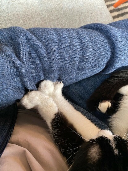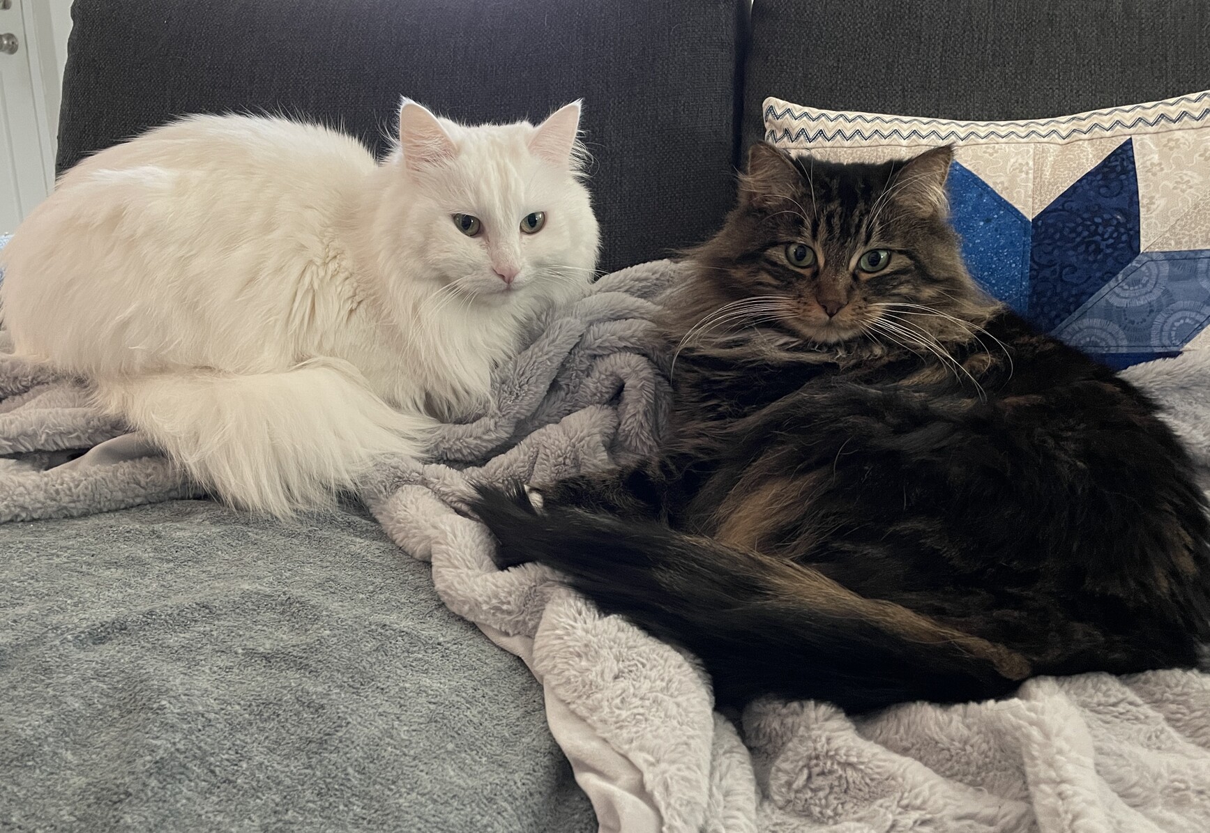 Even though these girls are sisters, they usually keep their distance from each other. A cold and rainy day has brought them together on the fuzzy couch blanket. #CatsOfMastodon #EarlyCaturday