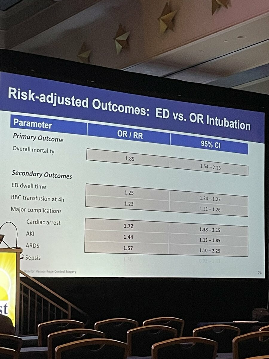 ED intubation is associated with worse mortality for patients undergoing surgical traumatic hemorrhage control (compared to OR intubation)