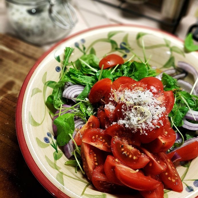 Gestern wanderte die erste selbstgezoge Rauke des Jahres in den Salat - mit Tomaten, Zwiebeln und frisch gemachtem Rosmarin-Zitronen-Salz. Dazu gab es gebratene Doraden.