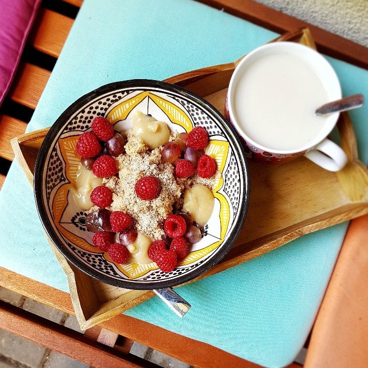 #DailyPorridge: Süßer Couscous mit meinem Orientzucker (Rezept im Blog), gemahlenen Haselnüssen, Trauben, Himbeeren, Apfel-Bananenmark. Die Portion fürs Kind ist zum Vertilgen nach der Kita beiseite gestellt. // Sweet Couscous with orientsugar (recipe is in the blog, link in bio), grounded hazelnuts, raspberries, grapes, apple-banana-sauce.