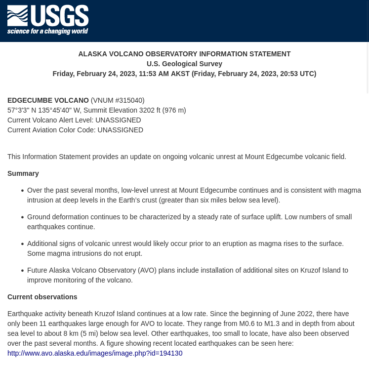 Most of the time when we hear about #Alaska #volcano activity, it's in the Aleutian Islands chain or Alaska Peninsula. Mt #Edgecumbe is 15mi/24km west of Sitka in the panhandle. Unrest (quakes & uplift) are reason to be alert, but doesn't necessarily mean it will erupt. Notice from USGS Alaska Volcano Observatory: https://volcanoes.usgs.gov/hans2/view/notice/DOI-USGS-AVO-2022-04-22T10:45:32-08:00 #geology