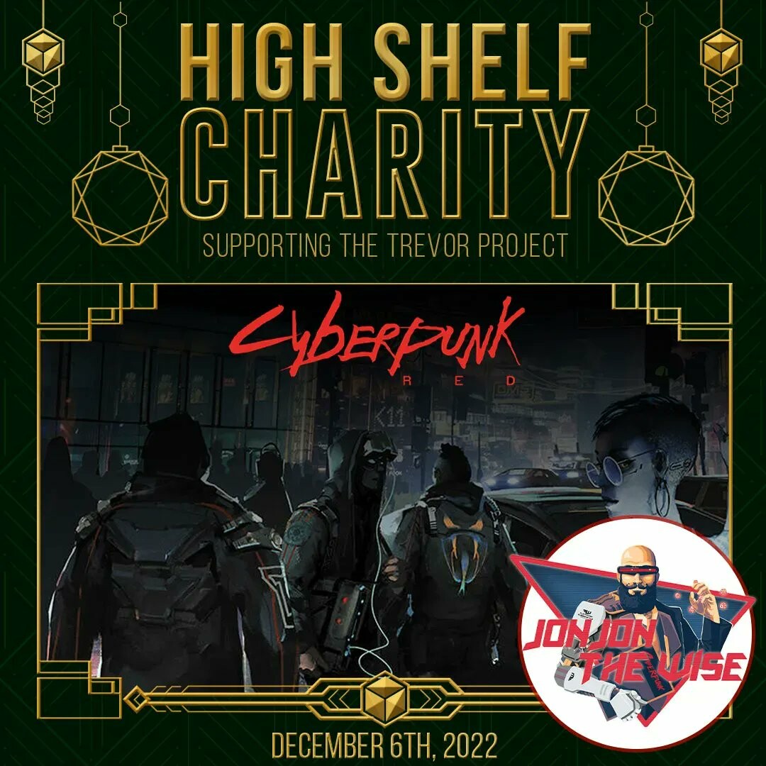 ❄ #HSCharity: 3 weeks till @jonjonthewise@twitter.com kicks off our Winter Charity Event w/ some #CyberpunkRED by @RTalsorianGames@twitter.com. Our #edgerunner crew will consist of @HighShelfDavid@twitter.com, @Nate_B@twitter.com, @NoAmandaStahp@twitter.com & @LogantheGM@twitter.com!