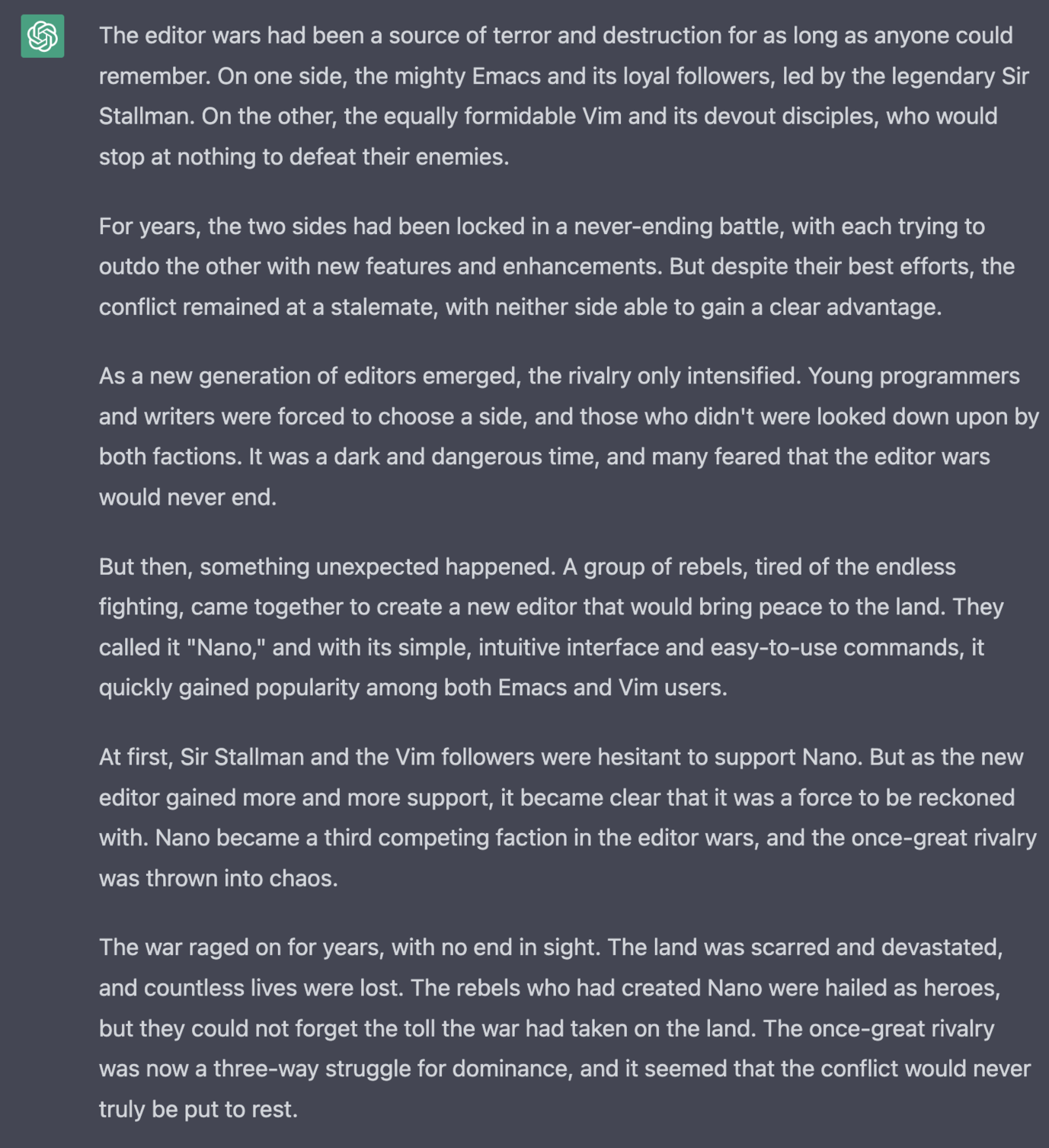 #ChatGPT writes a fantasy story about the #editorwars between #eMacs and #vim with some added action from #Nano