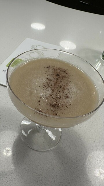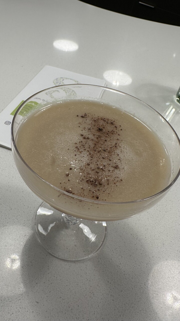 Scratch WAcino Potato Vodka, fresh coffee simple syrup, almond milk/coconut creamer, shaken & served up with a dash of code powder.