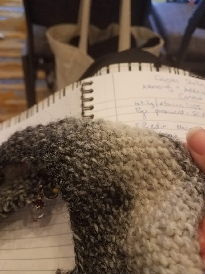 It probably shouldn't be so surprising to me that a lot of copyeditors knit, but it always delights me. At last week's #EFACon, I got to meet several folks who knit. Here's a picture of me knitting during one of the sessions.