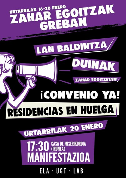 Nafarroako adinekoen egoitzetako langileek greba eginen dute urtarrilaren 16tik 20ra, biak barne, sektoreko lehenbiziko hitzarmena lortzeko bidean.