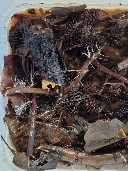 We zijn nu een weekje verder in het slijmzwammenprojectje. Er beginnen zich al dingen te vormen, alleen niet de gewenste π Blijkbaar zij er nog enkele takjes en elzenproppen die wortel kunnen vormen ... hopelijk kweek ik zo geen Elzenbosje, want dat is nu niet direct de bedoeling