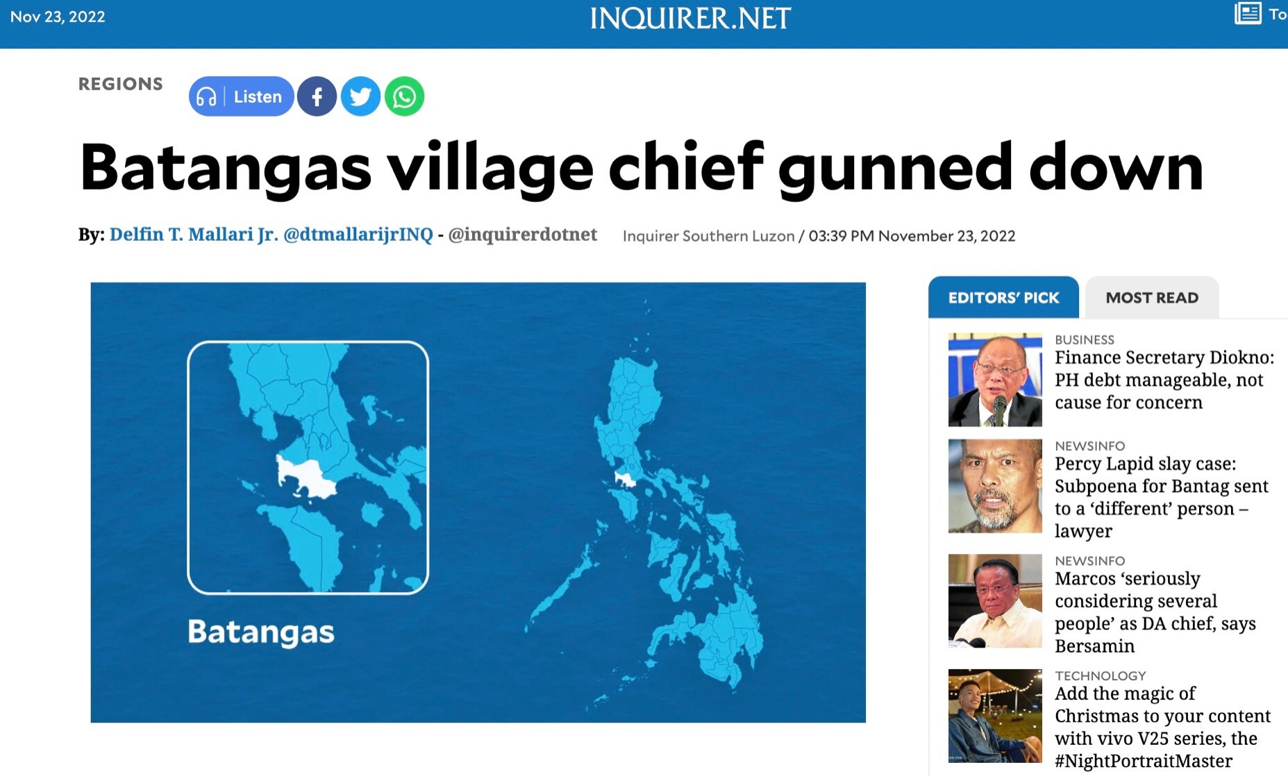 Batangas village chief gunned down | Inquirer News https://newsinfo.inquirer.net/1696970/batangas-village-chief-gunned-down