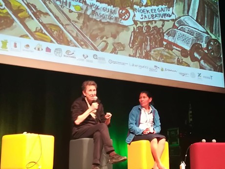 Vidalina Morales y Silvia Federici destacando la #lucha ecofeminista de las #mujeres comunitarias en la #defensa del #territorio ante los crueles proyectos extractivistas patriarcales, imperialistas y capitalistas @ekologistak@twitter.com @ades_sm@twitter.com @no_mineria_sv@twitter.com #Ekozinemaldia