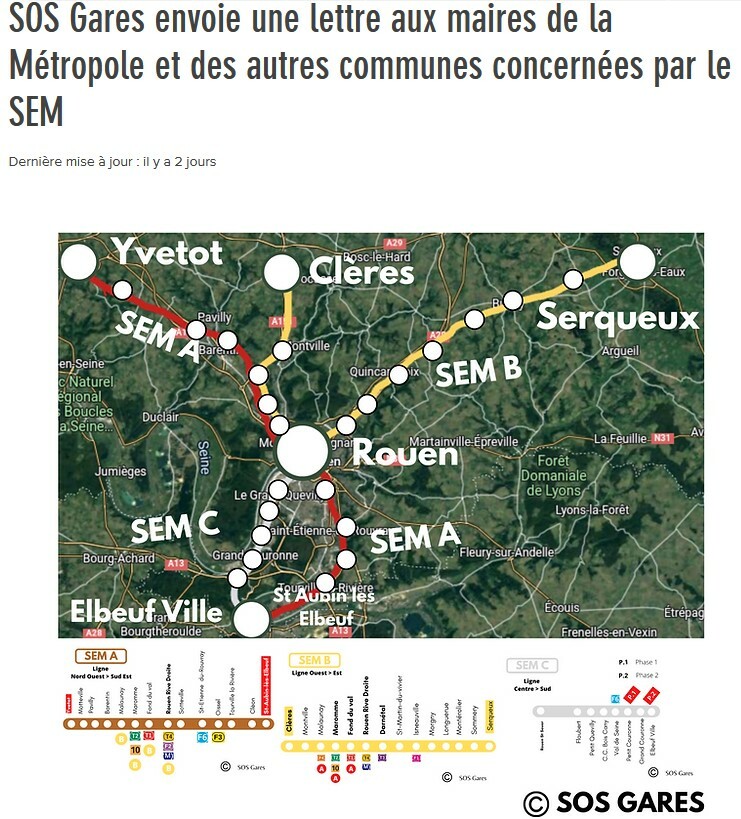 si vous êtes exclu(e)s du train, ce transport pratique, rapide et écologique, votre signature sera utile à la pétition ci-dessous... Il s'agit, aux côtés de "SOS Gares", de mettre en place le Service Express Métropolitain Rouennais (SEMR) sur les rails !