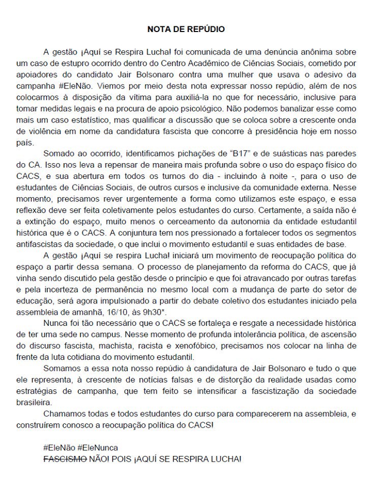 RT @nalucianalucia@twitter.com Estupraram uma menina no centro acadêmico de ciências sociais da UFPR porque estava com um adesivo #EleNão. Isso não é um ataque à apenas ela e sim à toda sociedade acadêmica da UFPR. Tô desolada, onde é que vamos parar ?
