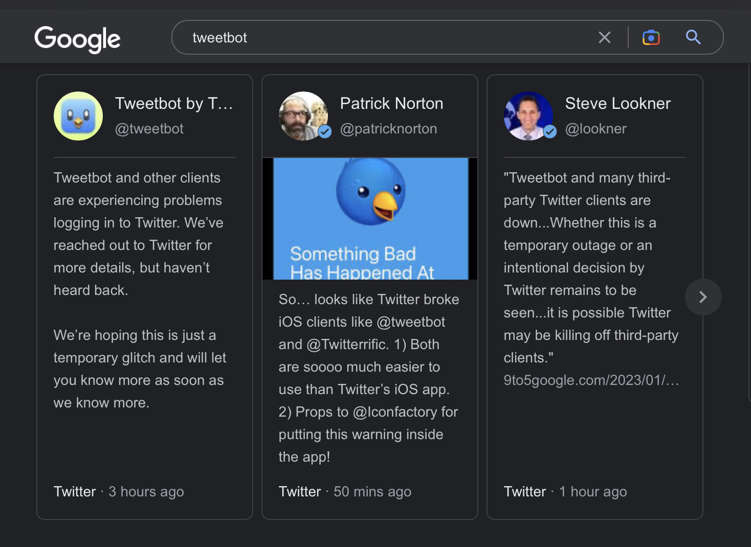 #SpaceKaren’s $8chan dumpster fire continues - major iOS twitter clients Twitterrific and Tweetbot have both failed in the last three hours, with neither able to get clear answers on what’s failed, why, or when it will be fixed. #Twitter #BirdSite #ElMu