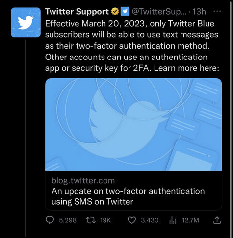 Now I understand. Elon is just protecting his pocket and likely main revenue stream at twitter. Twitter blue subscribers must be at least 99% trolls, so he canβt switch off the text verification for them.