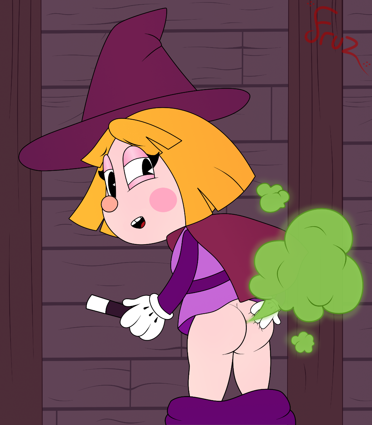 Checking a book of spells, she tries one of them, but realizes her butt has grown a little and her pants got pulled down.