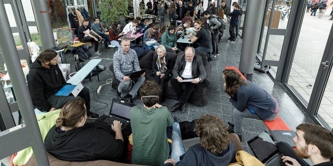 Heute Mittag konnte die #EndFossil Besetzung des @KITKarlsruhe@twitter.com einen kleinen Teilerfolg erzielen. Es gab eine Gesprächsrunde mit Vertretern von Präsidium und Verwaltung.