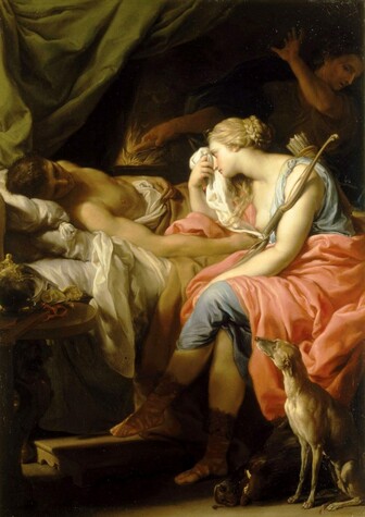Image is "Atalanta Crying Over The Body of Meleager" by Pompeo Batoni (1743).