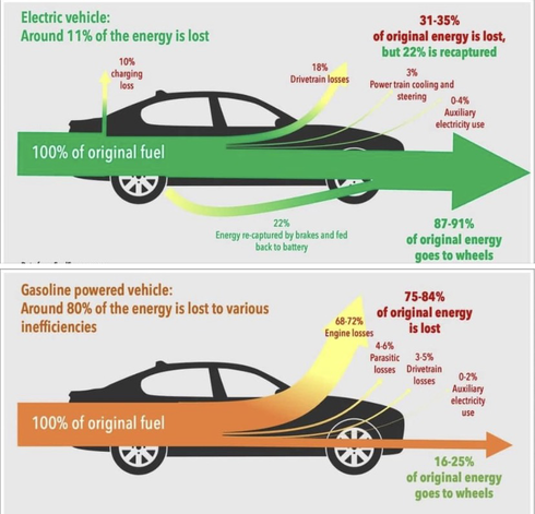 Fantastic data visualisation of the energy efficiency comparison for electric vehicles and combustion engine cars. An astonishing two thirds is lost in an ICE car, compared to only a tenth in an EV. Break recuperation allows an EV to regain lots of energy. Source: fueleconomy.gov #energyeffiency #energy #electricvehicles