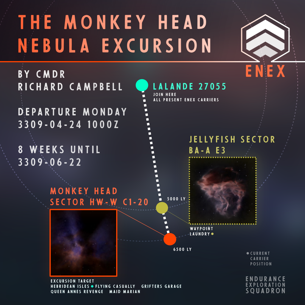 Three days left until "The Monkey Head Nebula Excursion". Ready your exploration ships. Carrier "ENEX laundry" is already deployed at the Jellyfish waypoint (see updated info-graphic)