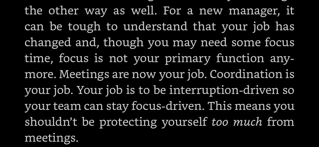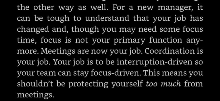 Very well put @sarah_edo. I constantly hear managers complain about how they spend a lot of time in meetings. I usually say meetings are moments when we can apply leverage (I must have read this somewhere π€), but you describe it in a much better way π #engineeringmanagement #engineeringleadership