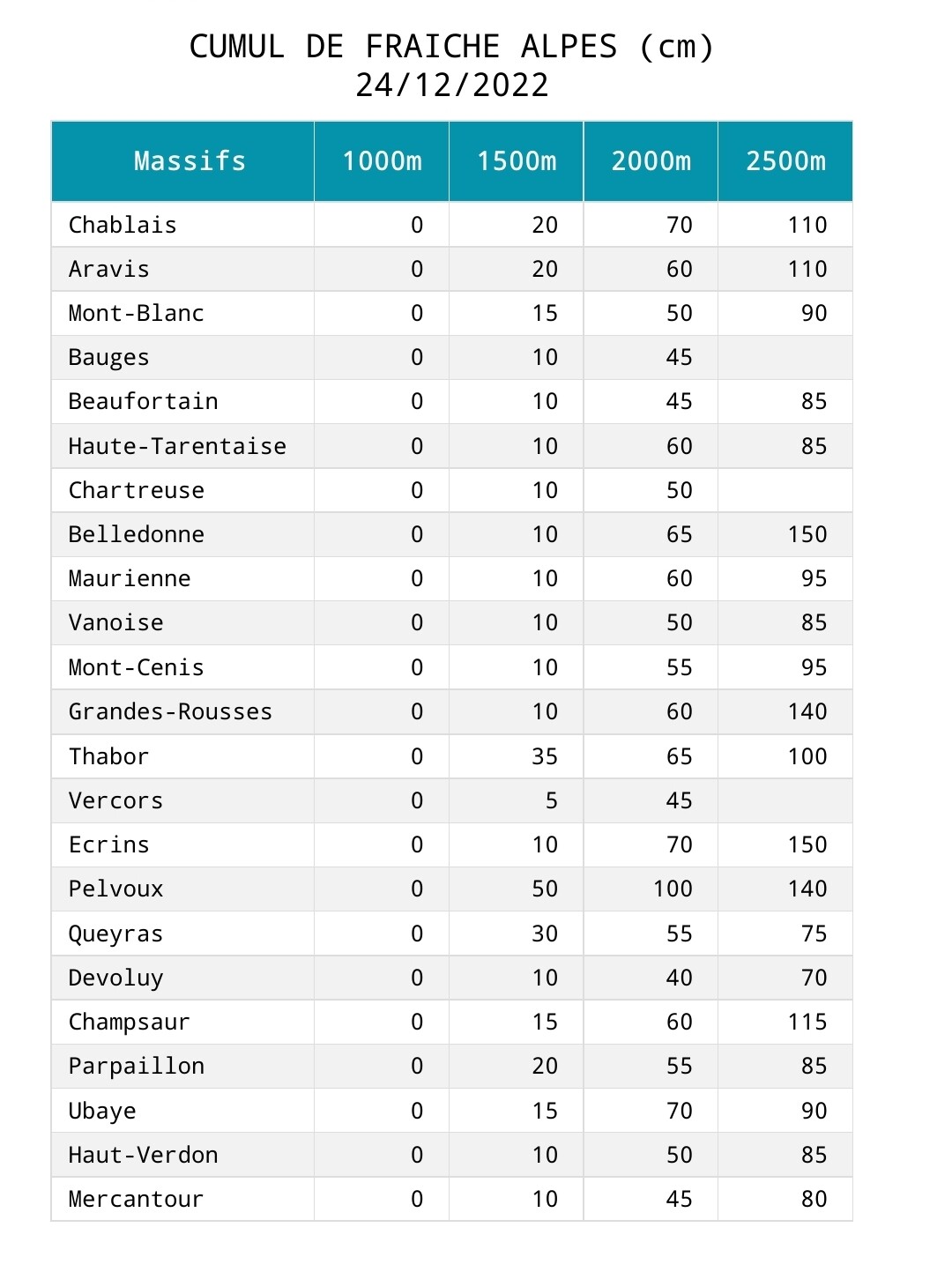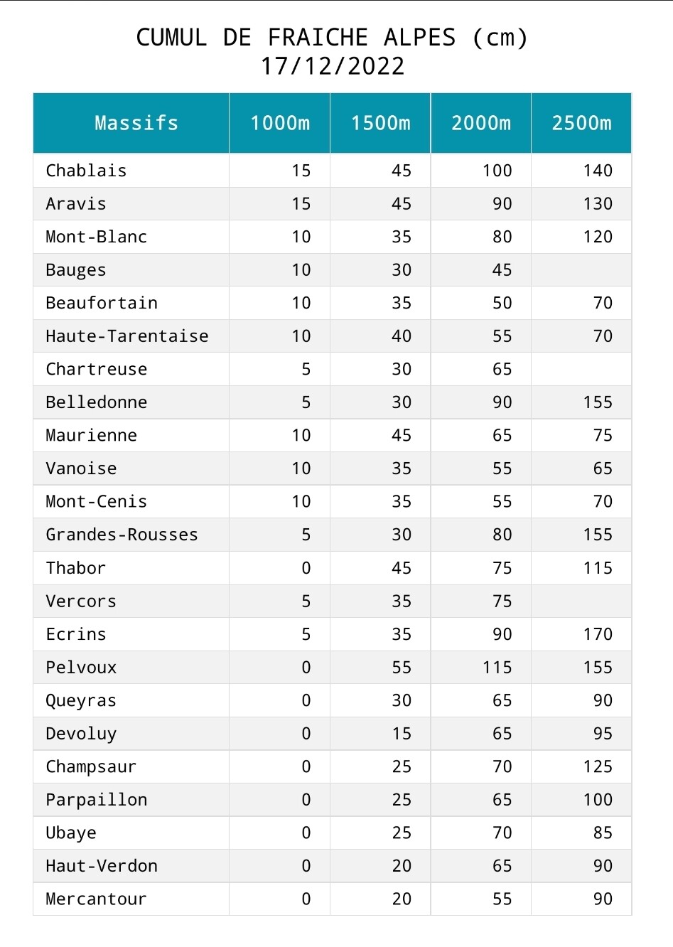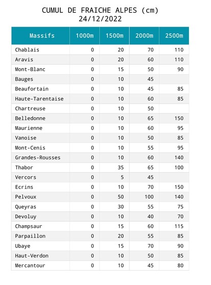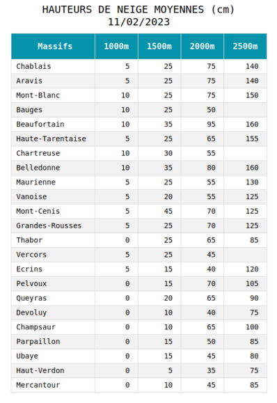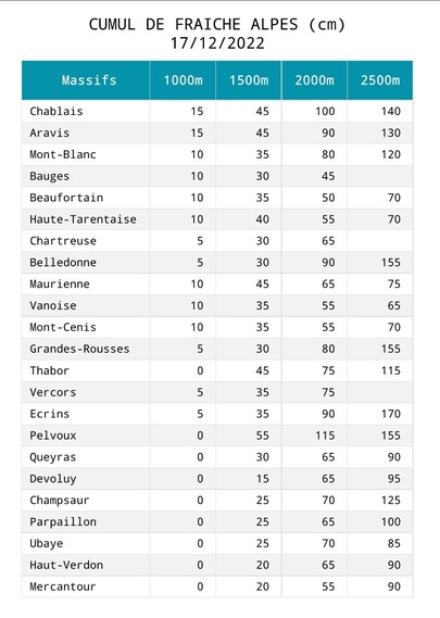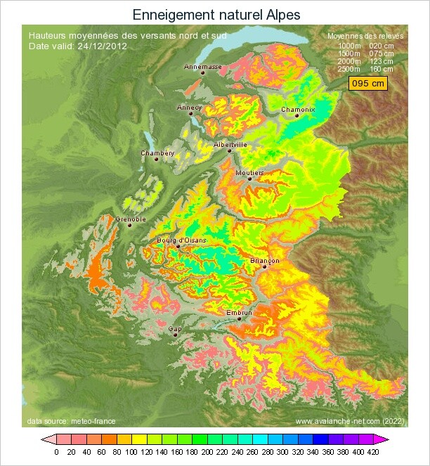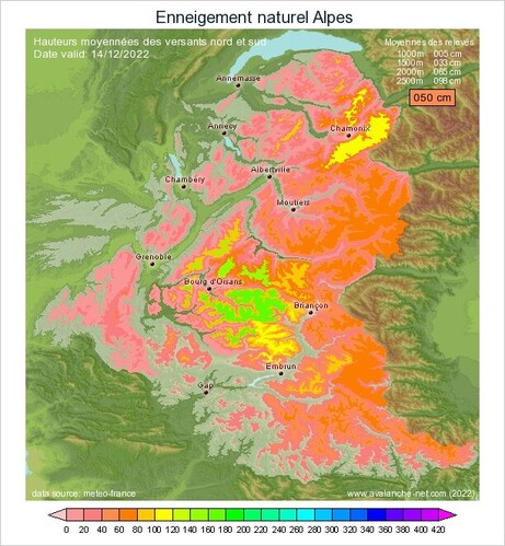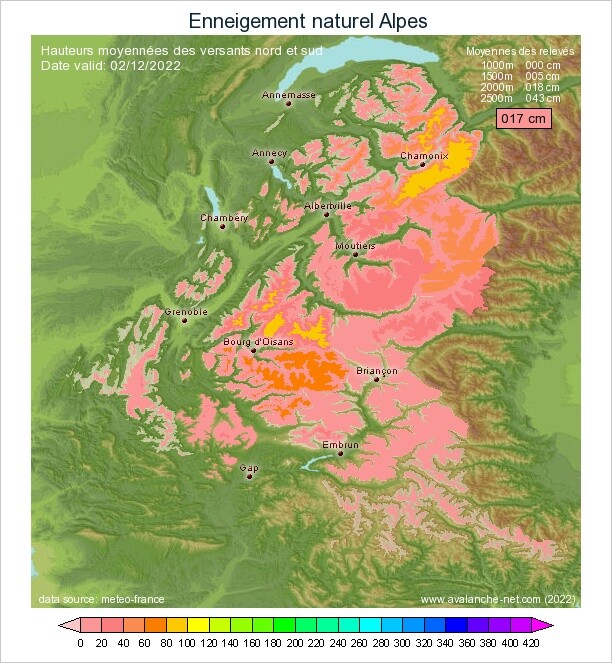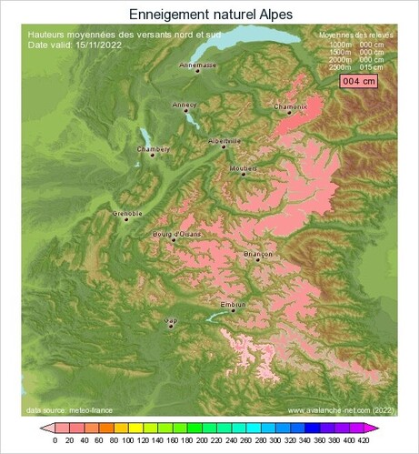 Alpes du Sud, la situation est meilleur puisque les massifs du Queyras, Ubaye et Mercantour, sont excédentaires dès 1500m. Seul le Devoluy présente un léger déficit.
