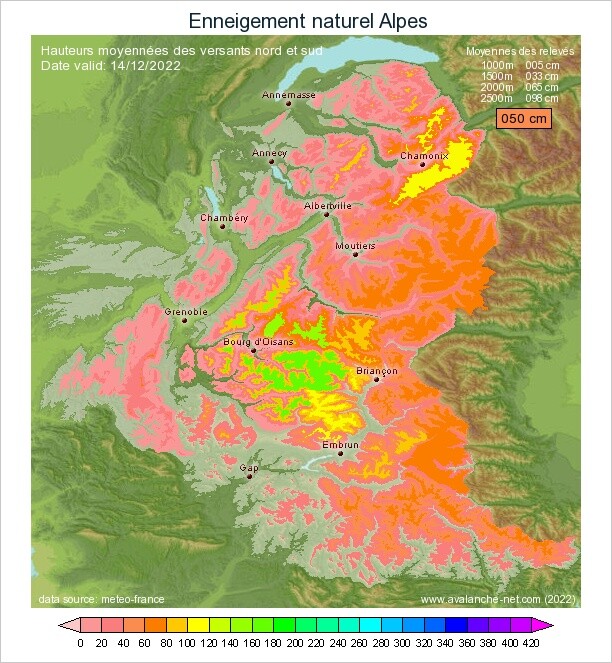 Enneigement de saison au-dessus de 2500m sur Belledonne, Écrins, Grandes Rousses et Pelvoux.