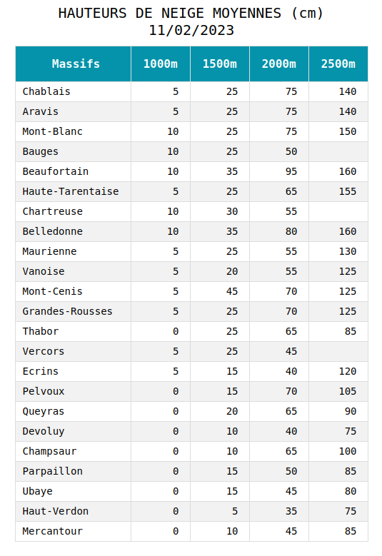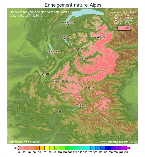 Alpes du Nord, TOUS les massifs de 1000m à 2500m ont un enneigement déficitaire pour une fin de première décade. Le déficit est important (>40 à 50%) jusqu'à 2000m. Le retard est moins marqué à 2500m.