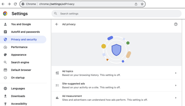 Infosec friends are unanimous: if you're using Chrome, you want to visit chrome://settings/adPrivacy and turn off Ad Topics, Site-Suggested Ads, and Ad Measurement.