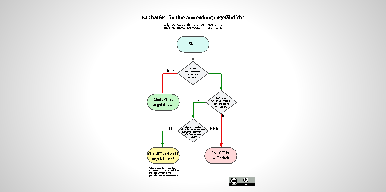 Aleksandr Tiulkanov hat im Januar ein Flussdiagramm als #Entscheidungshilfe erstellt, ob #ChatGPT und Freunde für eine bestimmte Anwendung #ungefährlich seien. Es ist IMHO nicht perfekt, aber eine gute Basis für Diskussionen. Ich habe es deshalb auf Deutsch übersetzt und ein paar Bemerkungen hinzugefügt.