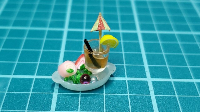 The glass, the "liquid" and the plater are UV epoxy casts. I handmade the umbrella from bamboo and paper, the straw is a wire. The content of the plater and the lemon are leftovers from the many miniature house kits I have.
