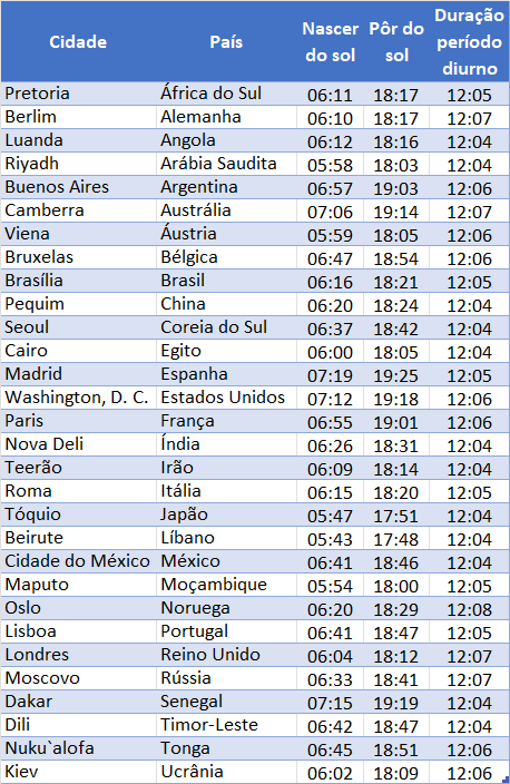 Nos dias dos equinócios é assim, o período diurno é praticamente igual em todos os locais do Mundo.
