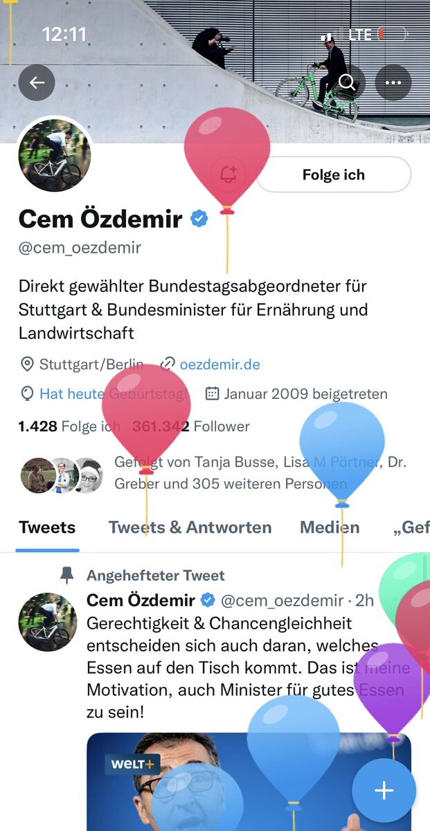 Twitter lässt im Profil von @cem_oezdemir heute die Luftballons steigen. Wüsste man es nicht besser, könnte man denken, Elon Musk feiert die heute vorgelegten Eckpunkte zur #Ernährungsstrategie…😉 Im Ernst: Herzlichen Glückwunsch zum Geburtstag!