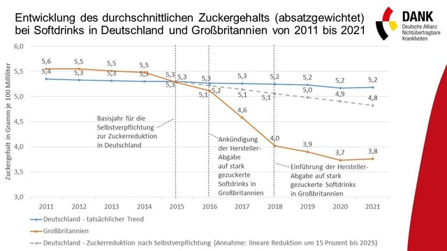 In DE ist der Zuckergehalt seit 2015 nur um etwa 2% gesunken, in UK um fast 30 Prozent.