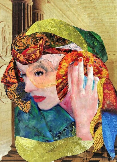 Fortuneteller. An alluring soothsayer wearing a silk turban. Can she divine your future? Handmade collage using paper and watercolor.