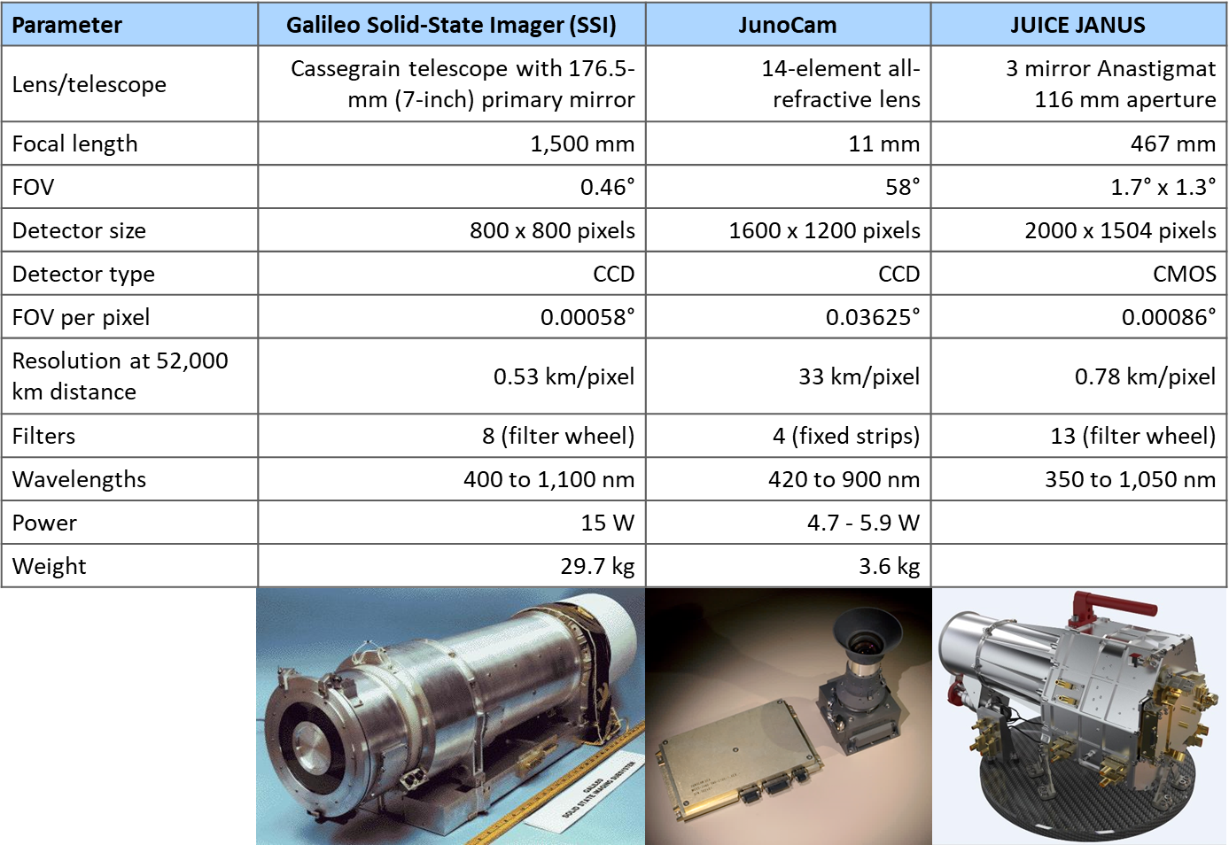 The JANUS camera onboard the JUICE spacecraft is certainly more capable than Juno's JunoCam in terms of detector size, aperture size and resolution; it is comparable to the imager on Galileo in resolution. See table below.