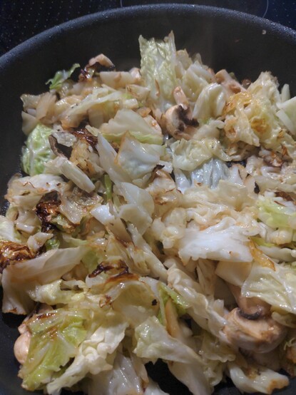 Kraut und Champignons sind eine gute Kombination, dazu noch Zwiebeln und Knoblauch und am Schluss den Rest Gorgonzola dazu, alles über die Nudeln ich glaub das wird gut 🤓