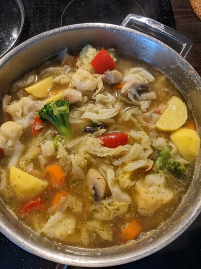 Heute im Topf: Wirsing, Champignons, Sellerie, Kartoffeln, Möhren, Blumenkohl, Brokkoli