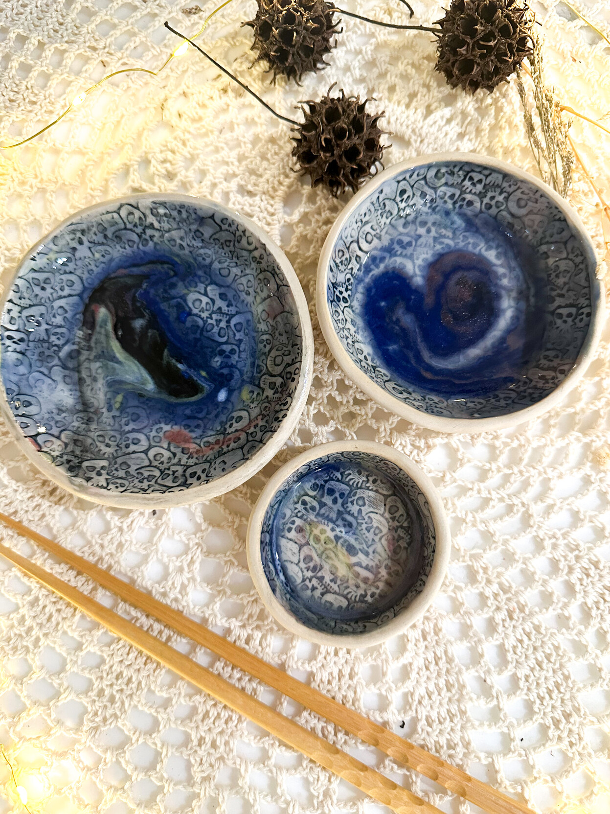 New set of small handbuilt skull dishes with a cool swirly glaze in my etsy shop: https://creatoriq.cc/3QfLS6B #etsycreatorco #pottery #skylls #handmade