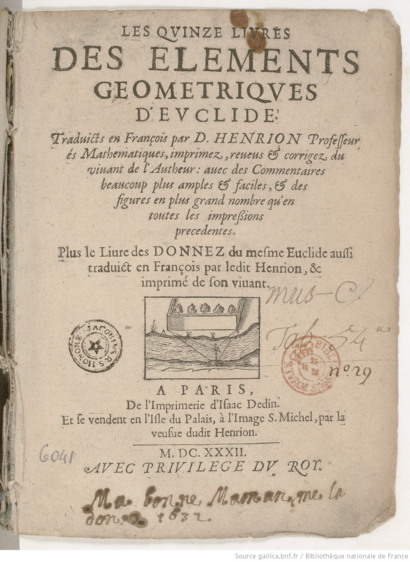 La première édition française des Éléments d'Euclide est parue en 1632, traduite et commentée par un certain Didier Henrion. La Bibliothèque nationale de France en a un exemplaire.
