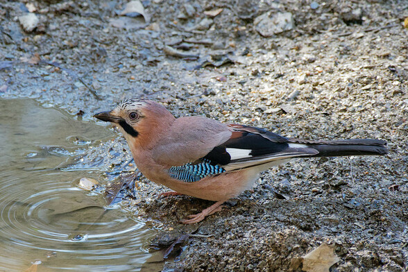 One Eurasian jay (Garrulus glandarius) drinking water in a puddle of water.