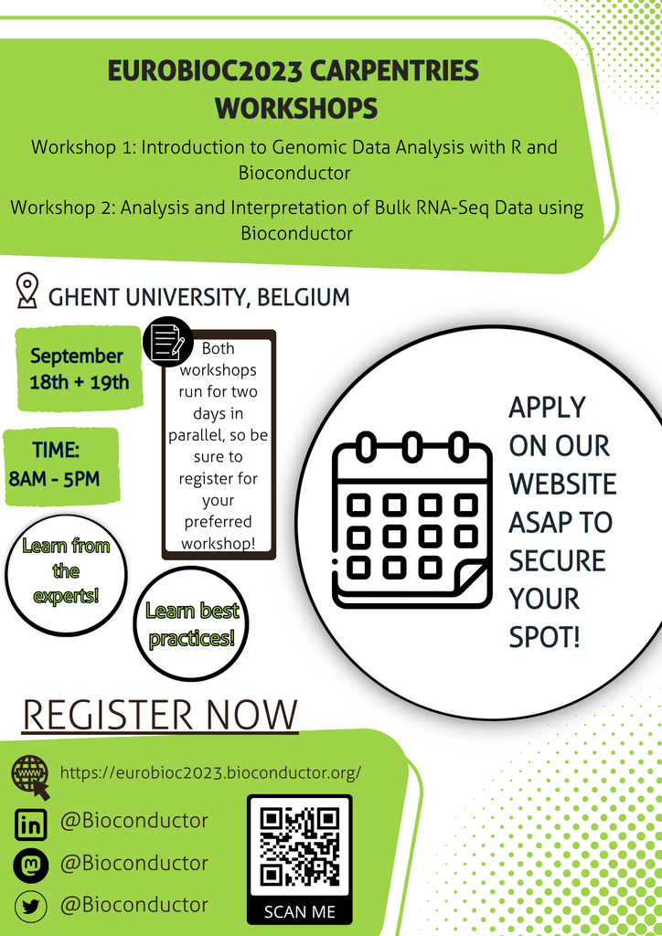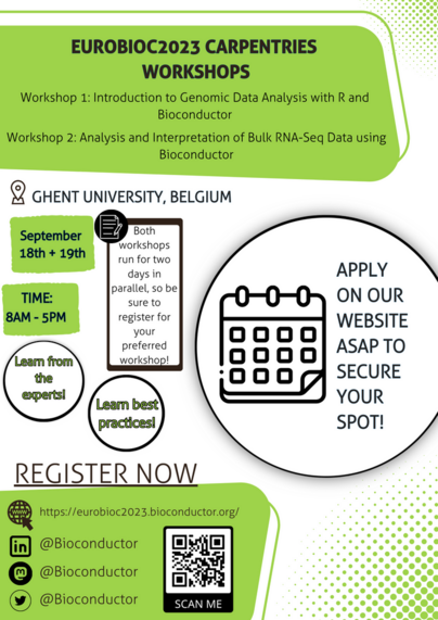 Don't miss out on the EuroBioC2023 Carpentries workshop! Enhance your skills by participating in one of these two day workshops!